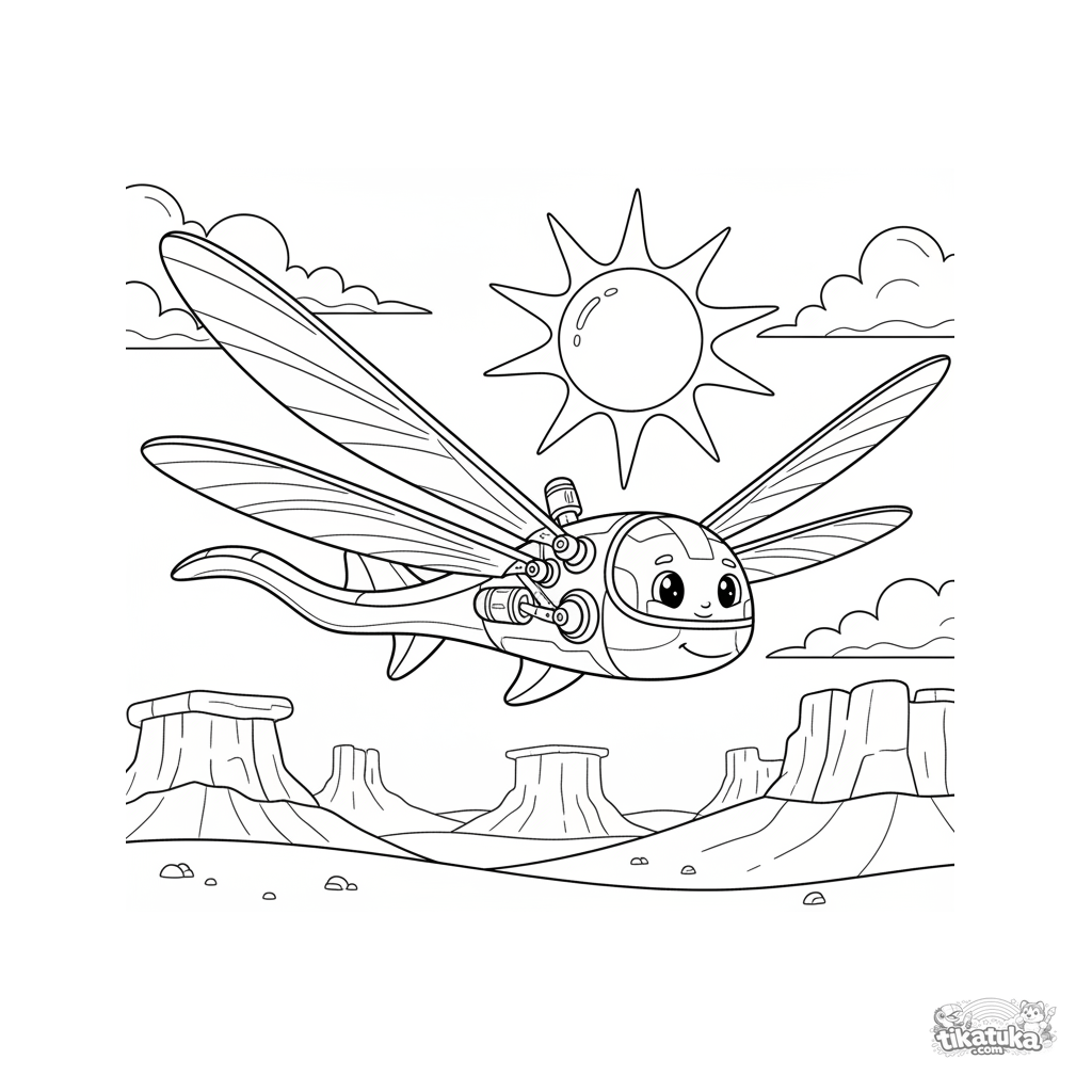 Fantasie-Ausmalbild eines Ornithopters – einer Flugmaschine mit schlagenden Flügeln – der über einer Wüste schwebt. Für Kinder von 4-6 Jahren. Interessante mechanische Details.