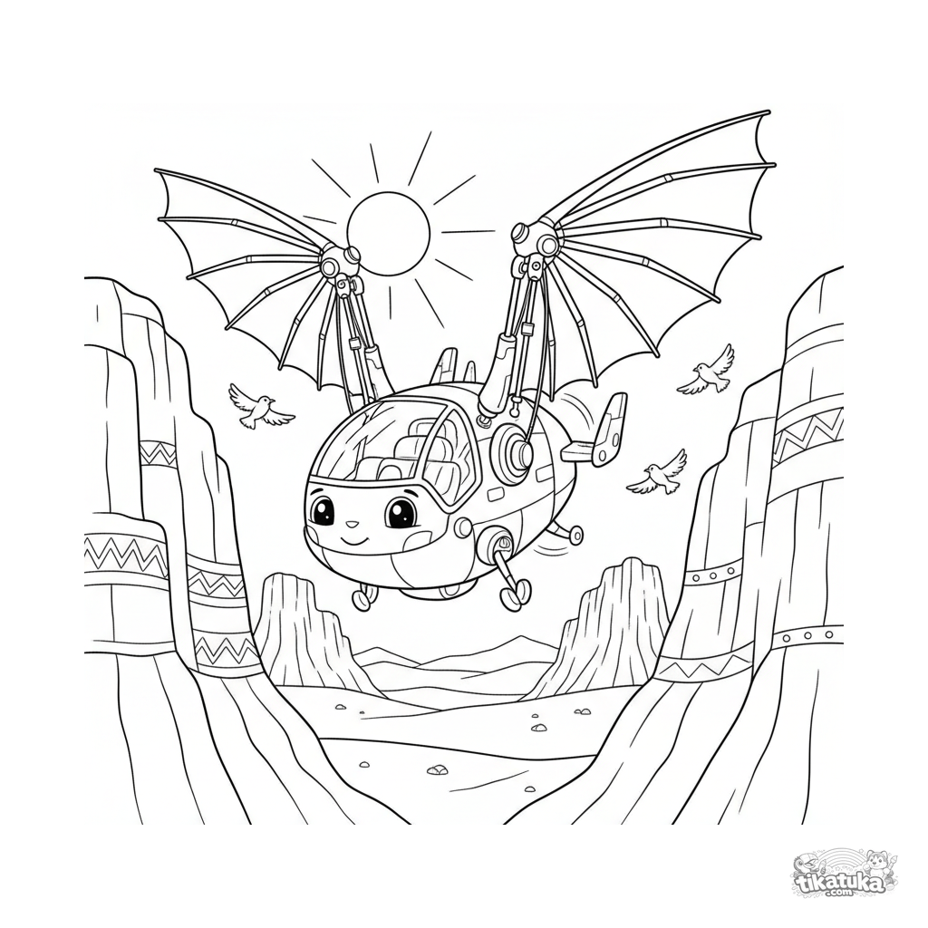 Ausmalbild für ältere Kinder 10-12: Ein futuristischer Ornithopter mit schlagenden Flügeln schwebt über Wüstenschluchten.