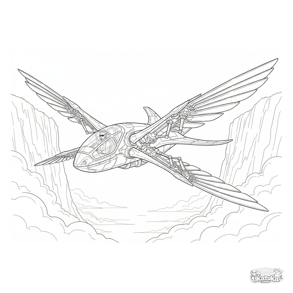 Komplexes Ausmalbild im Blaupausen-Stil: ein futuristischer Ornithopter mit Flügelschlag fliegt durch Nebel zwischen Klippen. Für Kinder von 10-12 Jahren.