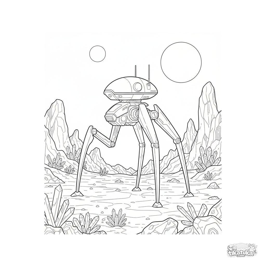 Ausmalbild für ältere Kinder: ein futuristischer vierbeiniger Späher-Läufer erkundet eine felsige Alien-Ebene. Für 7-12 Jahre.