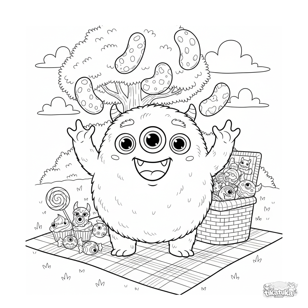 Detailliertes Ausmalbild für Kinder von 10-12 Jahren: ein felliges Monster jongliert mit Gummibärchen beim Picknick. Realistische Felltextur und Süßigkeitendetails.