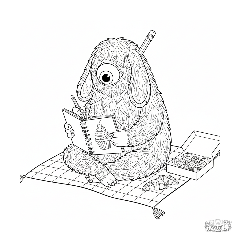 Detailliertes Ausmalbild für Kinder 10-12: Ein felliges Monster im realistischen Feldzeichnungs-Stil zeichnet Picknick-Süßigkeiten.