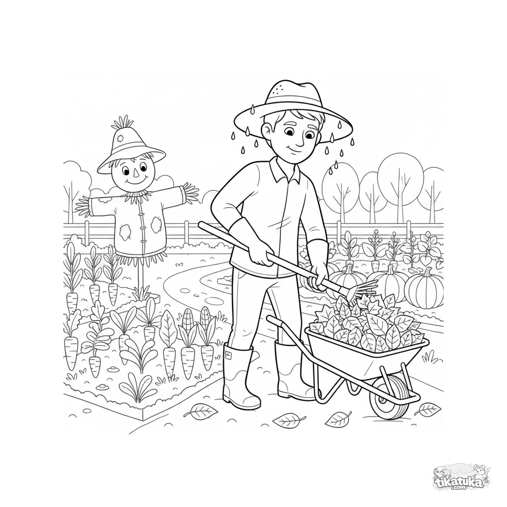 Ausmalbild für Tweens 7-9: Ein Gärtner in Stiefeln und Hut rechen nasse Blätter in eine Schubkarre auf einem Herbstgartenweg. Detaillierte Werkzeuge.
