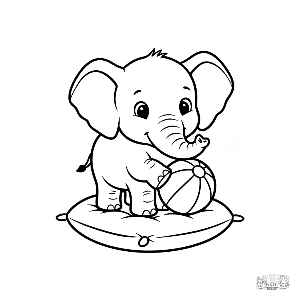 Ausmalbild für Kinder von 2-3 Jahren: ein sanfter Babyelefant steht auf einem Kissen und hält einen großen Ball mit seinem Rüssel. Klare, realistische aber einfache Formen mit großen Details.