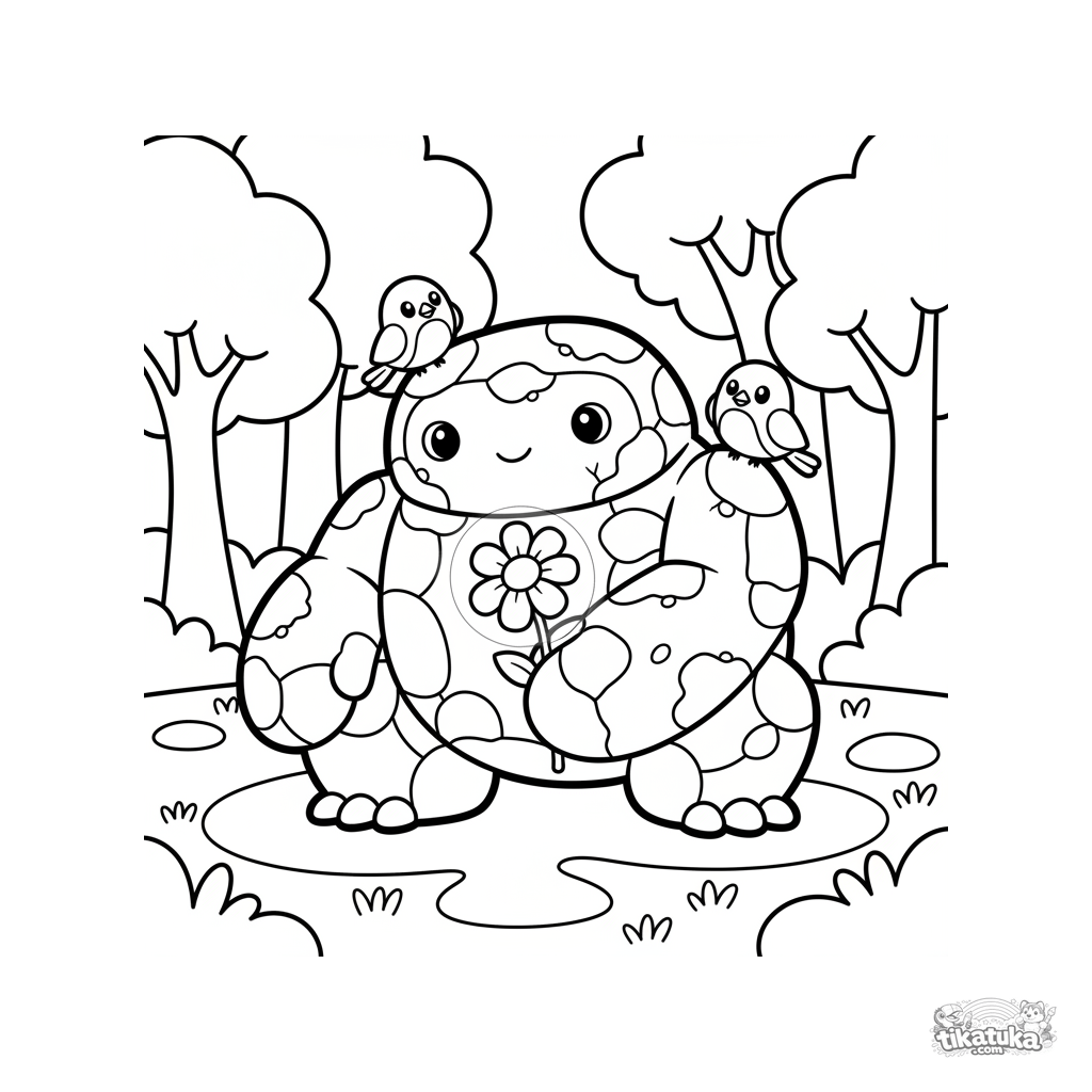 Einfaches Ausmalbild für Kleinkinder 2-3: ein großer, sanfter Stein-Golem hockt auf einer Wiese und hält vorsichtig eine leuchtende Blume.