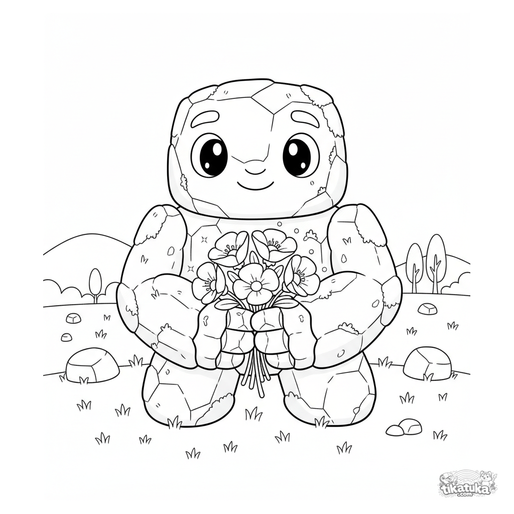Ausmalbild für 7-9 Jahre: ein freundlicher Steingolem hält in der Dämmerung vorsichtig einen Strauß leuchtender Mondblumen. Berührende Fantasieszene.