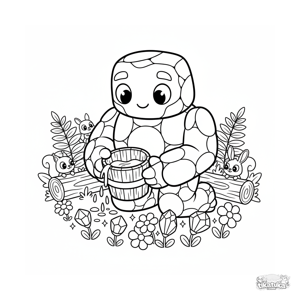 Einfaches Ausmalbild für Kleinkinder 2-3: Ein großer, sanfter Stein-Golem gießt magische Blumen in einem Wald. Große Formen, wenige Details.