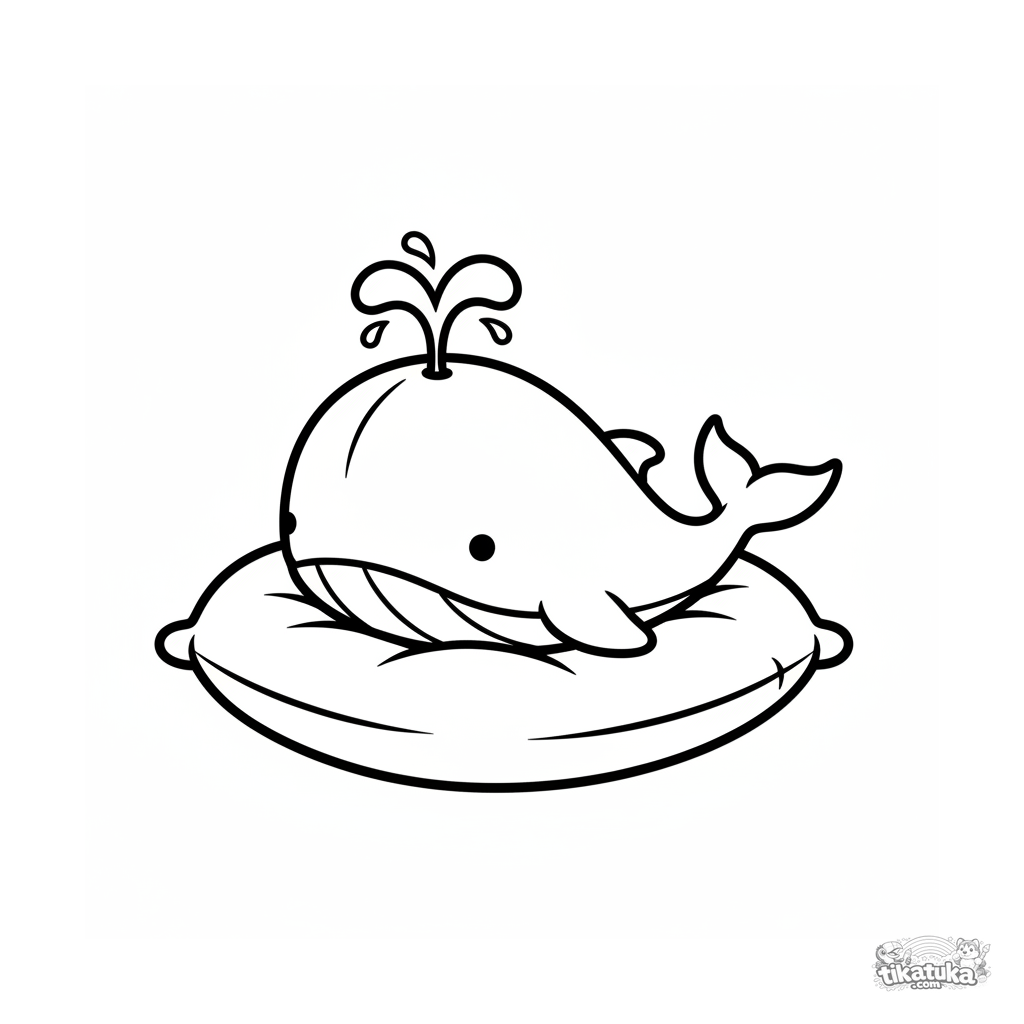 Weiches Ausmalbild für Kinder 2-3 Jahre: ein Plüschwal ruht auf einem Kissen. Glatte abgerundete Linien, ruhiges Bild, große Flächen zum Ausmalen.