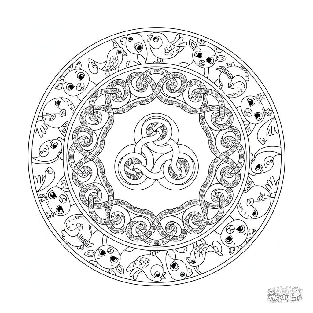 Komplexes keltisches Knoten-Mandala Ausmalbild für 10-12 Jahre. Zentraler Dreieinigkeitsknoten, verwobene Spiralen und dekorativer Tierumriss-Rand.