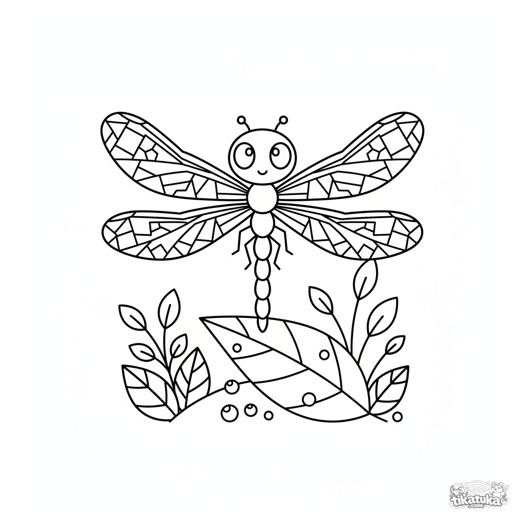 Ausmalbild für Kinder 4-6: Eine Libelle mit geometrischen Flügeln sitzt auf der Spitze eines Blattes mit Tautropfen. Minimalistisches, stylisches Design.