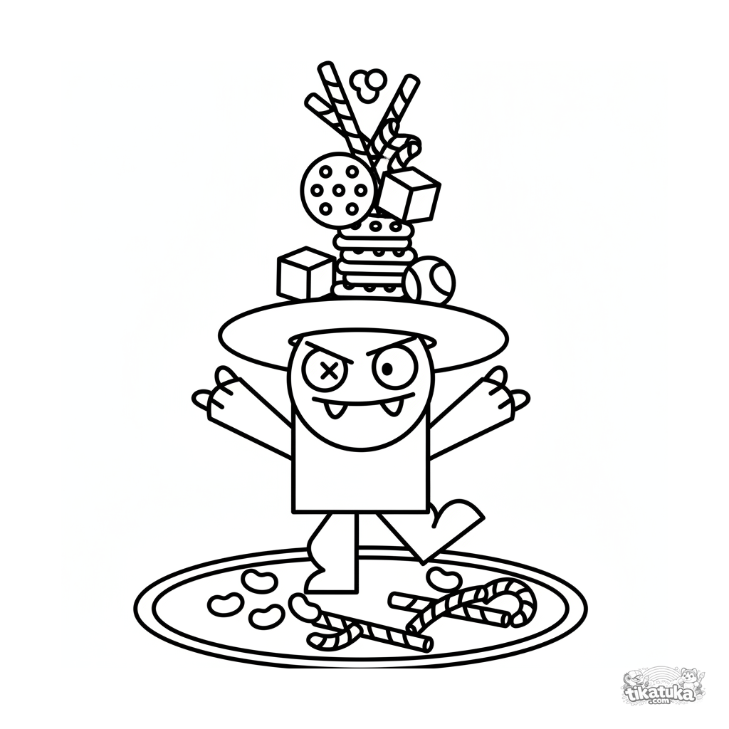 Ganz einfaches Ausmalbild für die Kleinsten: Ein geometrisches Monster balanciert einen Lecker-Turm. Große, klare Formen für 2-3 Jahre.