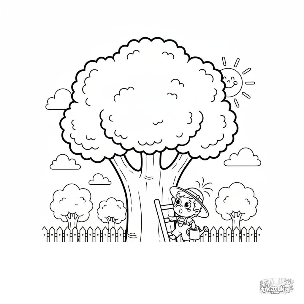 Lustiges Ausmalbild für Tweens 7-9: ein riesiger Brokkoli und ein winziger Gärtner mit Leiter. Humorvolle Szene mit klaren Details.