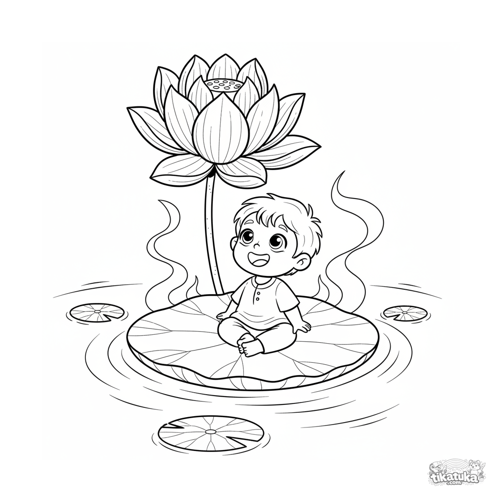 Ausmalbild für Kinder 7-9: eine magische Szene mit einer riesigen Lotusblume und einem Kind, das auf einem Blatt in einem Teich sitzt.