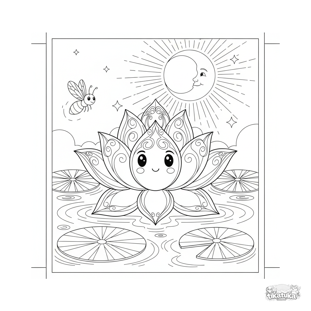 Ausmalbild für 10-12 Jahre: Eine riesige magische Lotosblume mit leuchtenden Blütenblättern schwebt auf einem ruhigen, mondbeschienenen Teich.