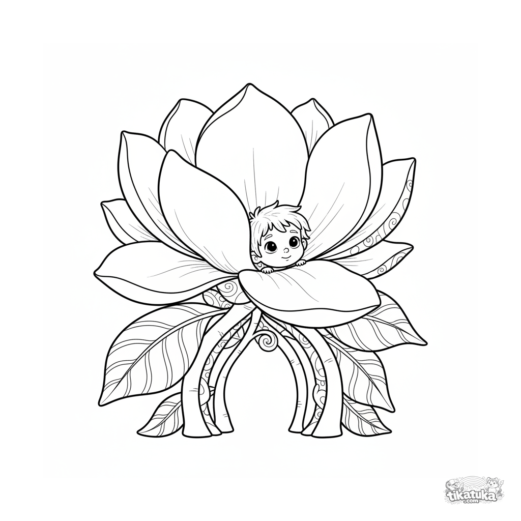 Komplexes Ausmalbild für ältere Kinder 10-12: Eine magische Riesen-Magnolienblüte mit einem Kind darin. Eine vielschichtige Szene mit reichen Details.