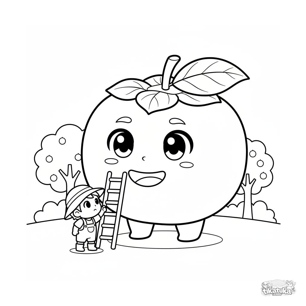 Ausmalbild für Kinder 4-6: eine fröhliche riesige Kaki und ein winziger Gärtner mit Leiter in einem Obstgarten. Chibi-Stil.