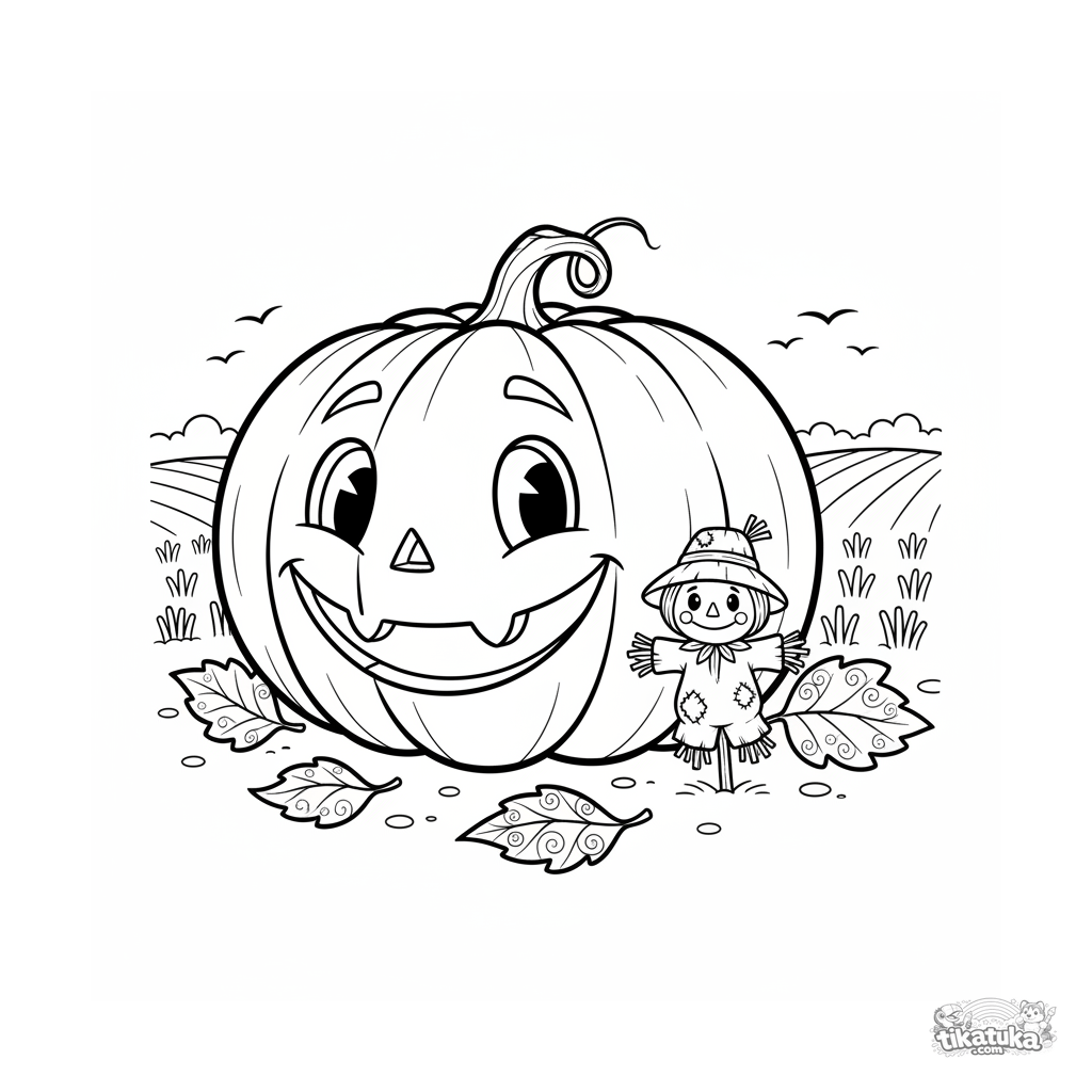 Lustiges Ausmalbild für Kinder 4-6: Ein riesiger lächelnder Kürbis und eine winzige Vogelscheuche auf einem Herbstfeld. Folk-Stil, Größenkontrast.
