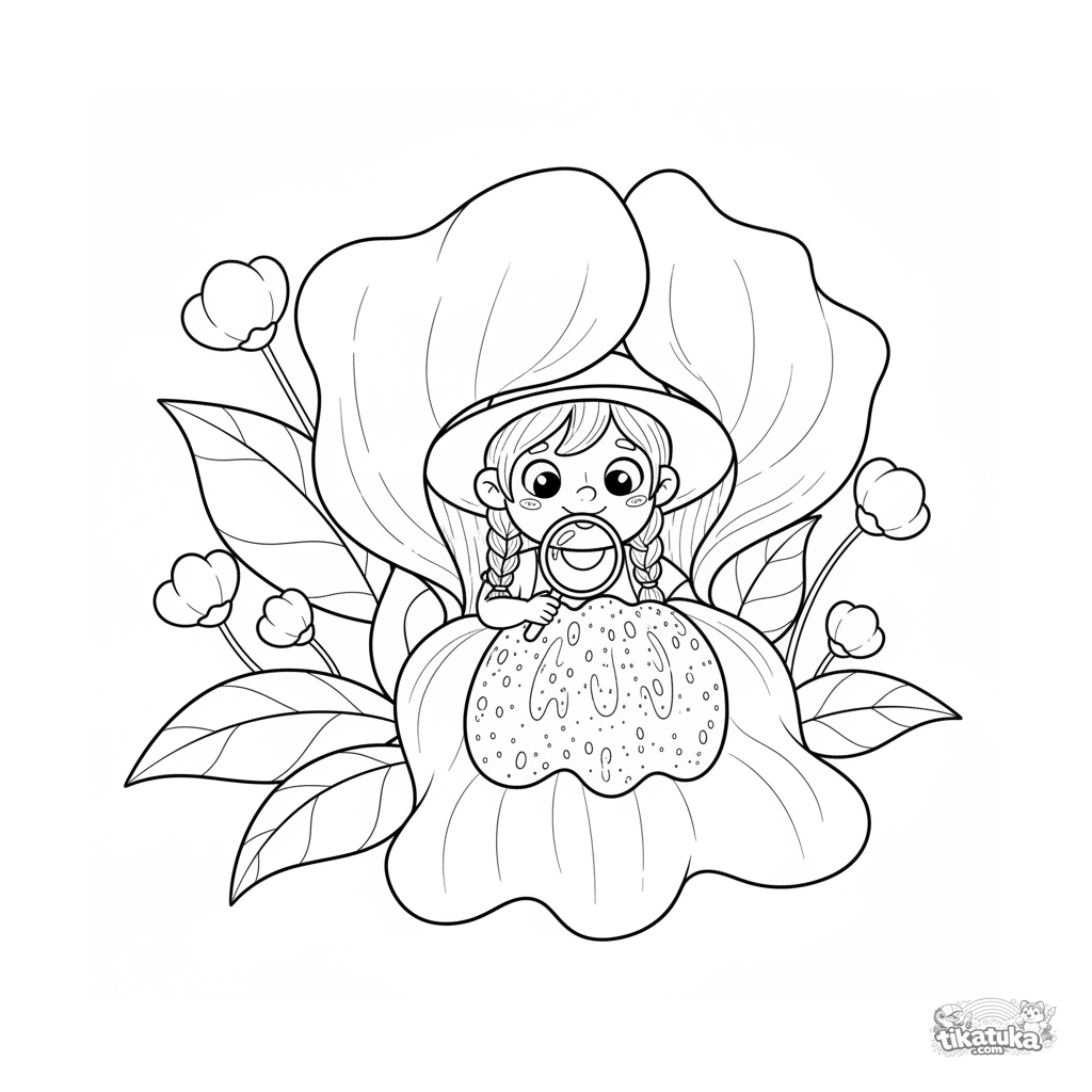 Ausmalbild für Kinder 7-9: Ein Kind erkundet eine riesige Löwenmaul-Blüte. Gartenszene mit vielen Details zum kreativen Ausmalen.