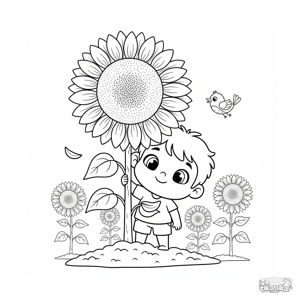Ausmalbild für Kinder 4-6: Ein lächelndes Kind lugt hinter einer Riesensonnenblume im Garten hervor. Einfache Formen.
