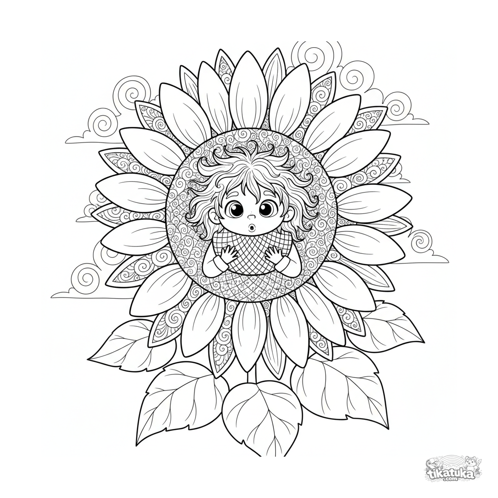 Komplexes Ausmalbild für 10-12 Jahre: eine riesige Fantasie-Sonnenblume, aus der ein erstauntes Kind lugt. Detaillierte Blütenblätter.