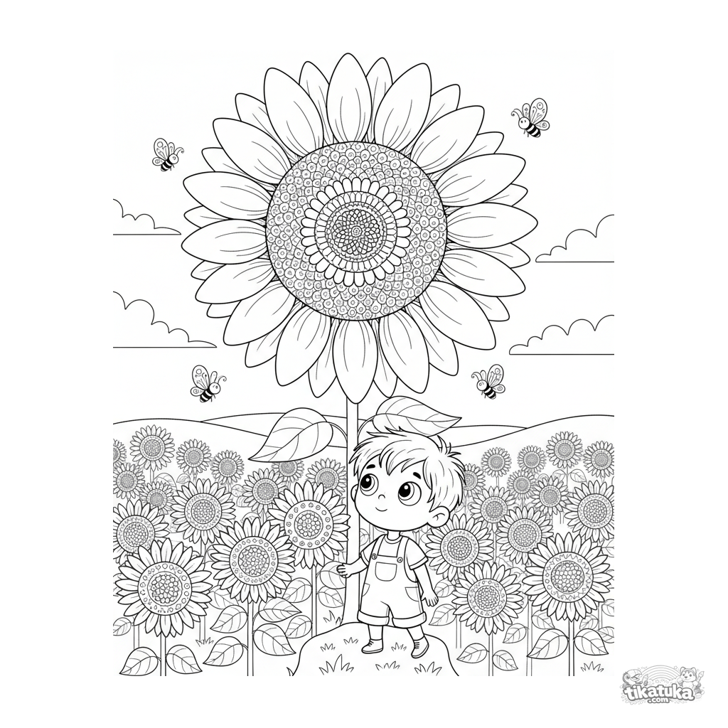 Detailliertes Ausmalbild für ältere Kinder 10-12. Eine riesige Fantasie-Sonnenblume auf einem Feld, ein Kind schaut hinein. Vielschichtige Szene, reiche Details.