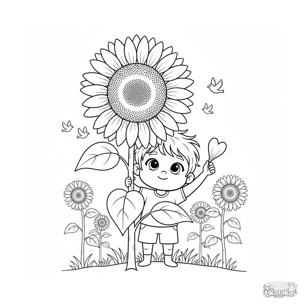 Ausmalbild für Kinder 4-6: Ein Kind spielt Verstecken hinter einer Riesensonnenblume im Garten. Eine fröhliche Szene.