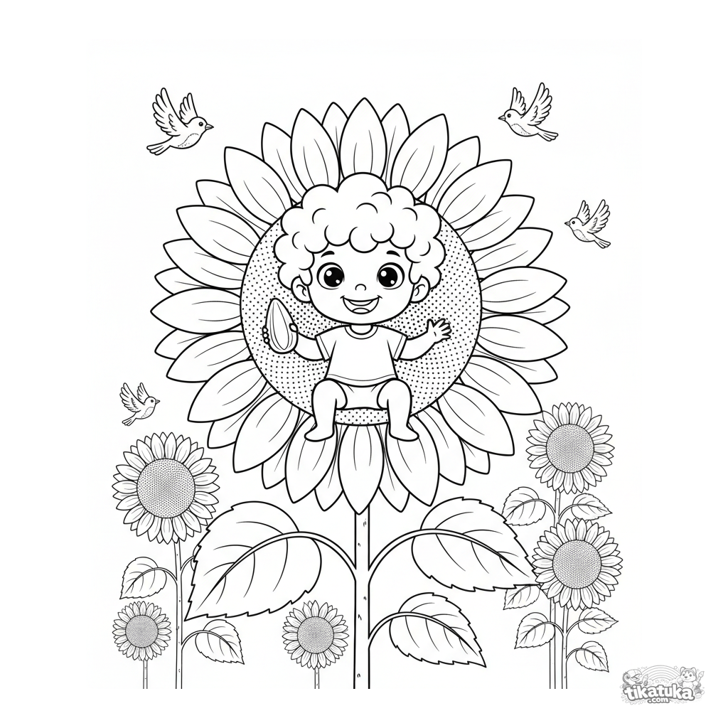 Ausmalbild für Kinder 4-6: Ein lächelndes Kind sitzt in einer riesigen Sonnenblume und hält einen Samen. Eine fantasievolle Gartenszene mit breiten Rändern.