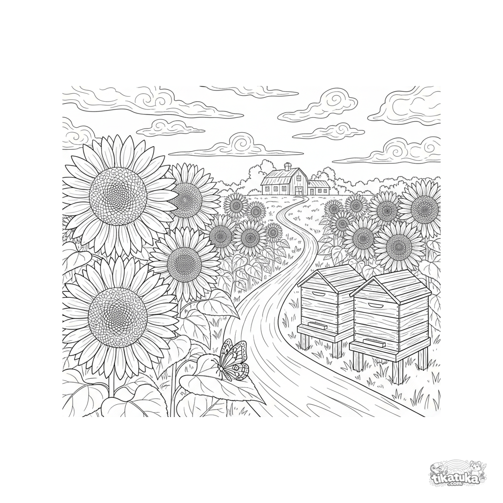 Ausmalbild einer detaillierten Landschaft: Riesensonnenblumenfeld, Bienenstöcke und ein Pfad. Für ältere Kinder 7-12. Komplexe Szene mit Schmetterling.