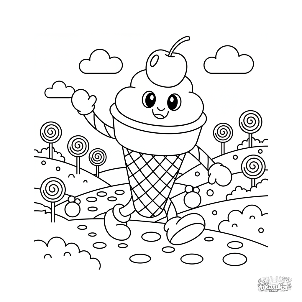 Einfaches Ausmalbild für Kleinkinder: Eine riesige laufende Eissünde spaziert durch ein Tal aus Kuchenhügeln und Süßigkeiten. Für 2-3 Jahre. Große, einfache Formen.