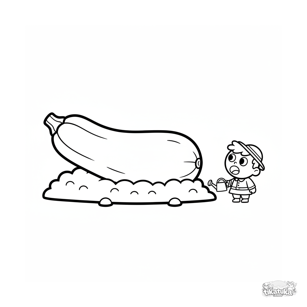 Einfaches Kleinkind-Ausmalbild: eine riesige Zucchini und ein winziger Gärtner. Große Formen, wenige Details. Für 2-3 Jahre.