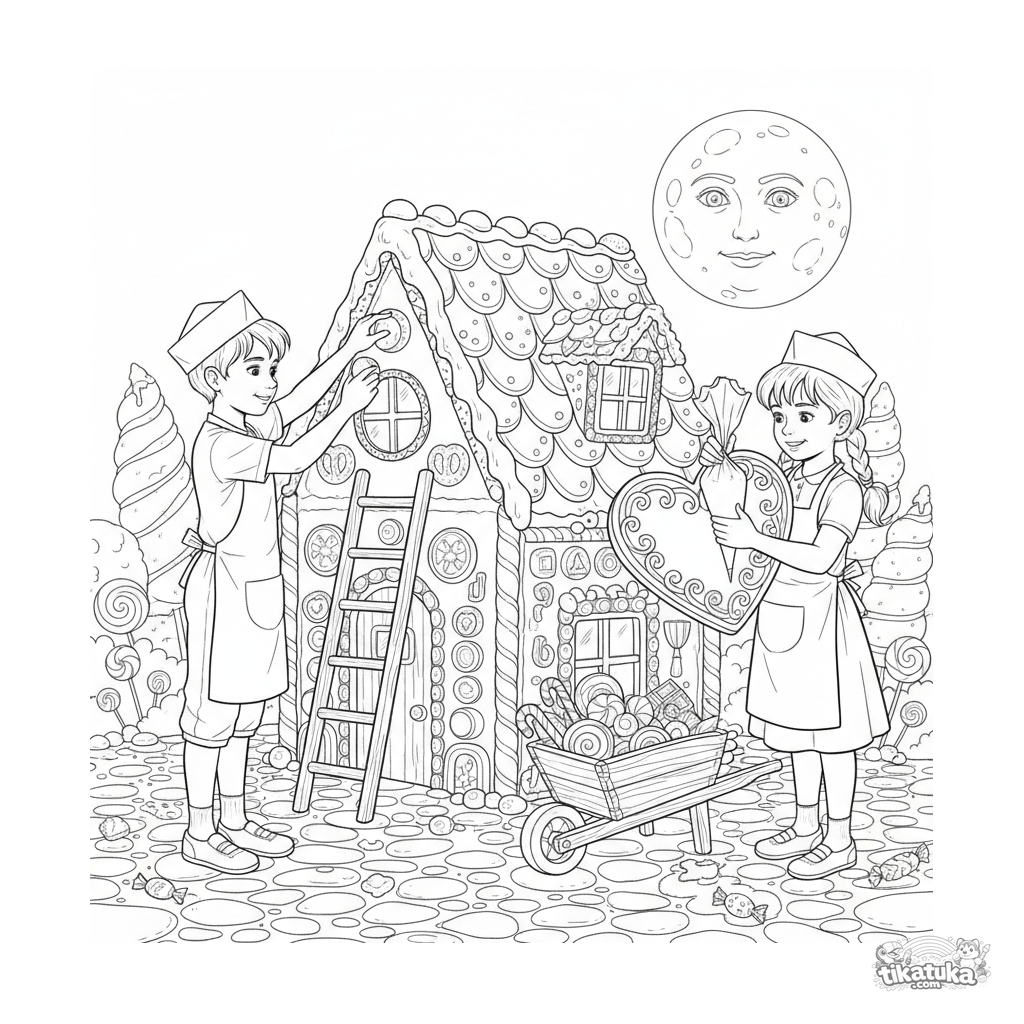 Märchen-Ausmalbild: Hänsel und Gretel bauen ihr berühmtes Lebkuchenhaus und dekorieren es mit Süßigkeiten. Für Kinder von 6-9 Jahren.
