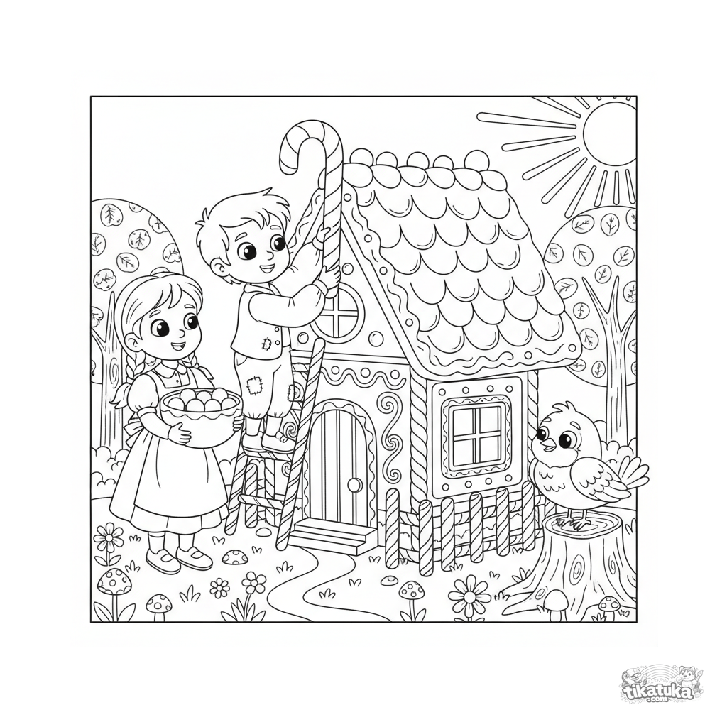 Märchen-Ausmalbild von Hänsel und Gretel, die ihr Süßigkeiten-Lebkuchenhaus bauen. Für Kinder von 6-9 Jahren. Viele süße, detaillierte Elemente zum Ausmalen.