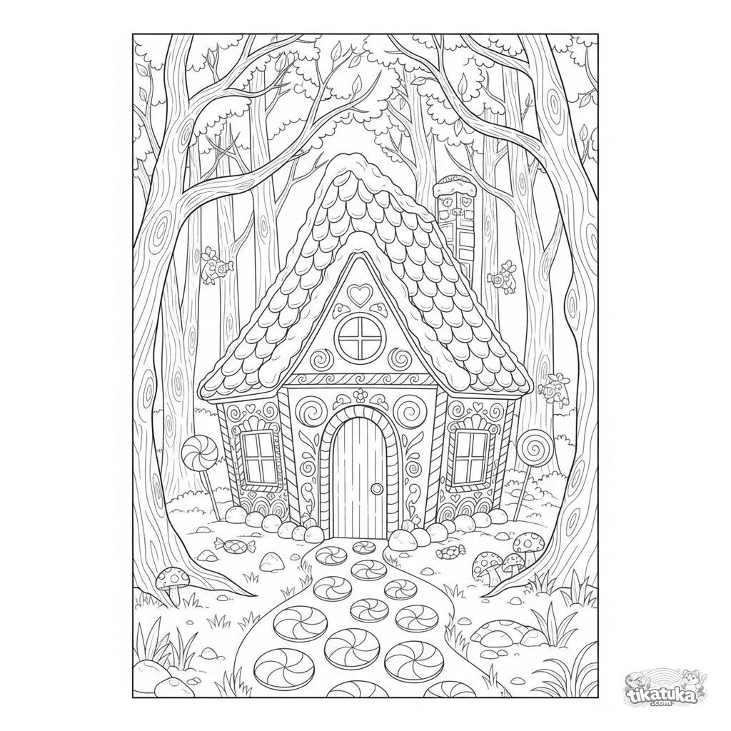 Detailliertes Ausmalbild aus dem Märchen 'Hänsel und Gretel' für Kinder 7-12 Jahre alt. Das Lebkuchenhaus versteckt im Wald, mit Süßigkeiten verziert.