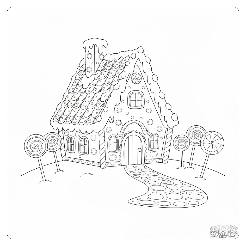 Märchen-Ausmalbild: das Lebkuchenhaus von Hänsel und Gretel. Ein Haus aus Keksen und Süßigkeiten mit Lollipop-Bäumen. Für Kinder von 5-8 Jahren.