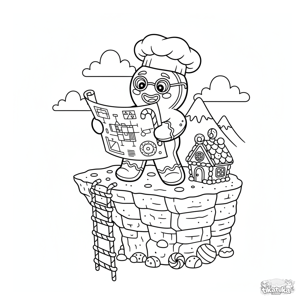 Märchen-Ausmalbild eines Lebkuchenmanns als Architekt, der Baupläne auf einer Keksklippe studiert. Verspielte Szene mit Süßigkeitendetails für Kinder von 5-8 Jahren.