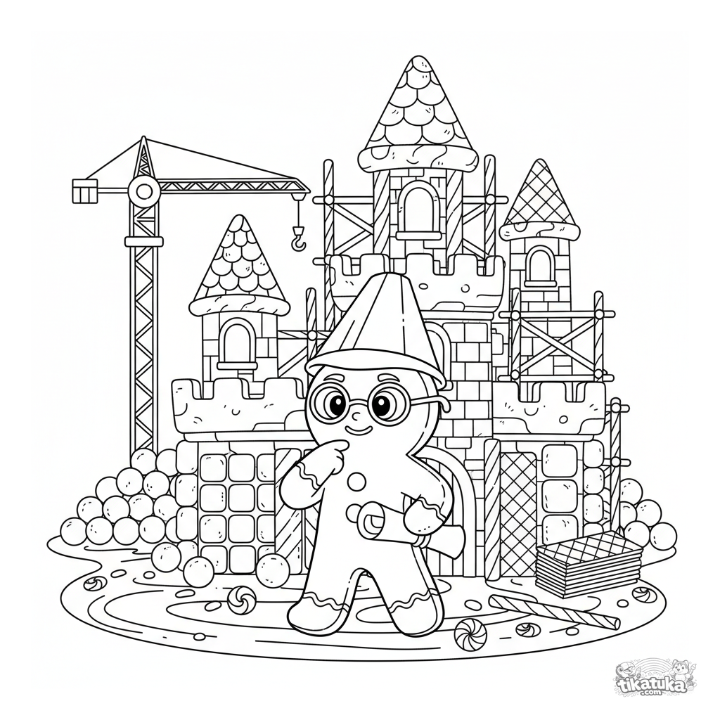 Märchen-Ausmalbild für Kinder von 5-7 Jahren. Ein Lebkuchenmann-Architekt begutachtet eine Baustelle für ein Süßigkeitenschloss.