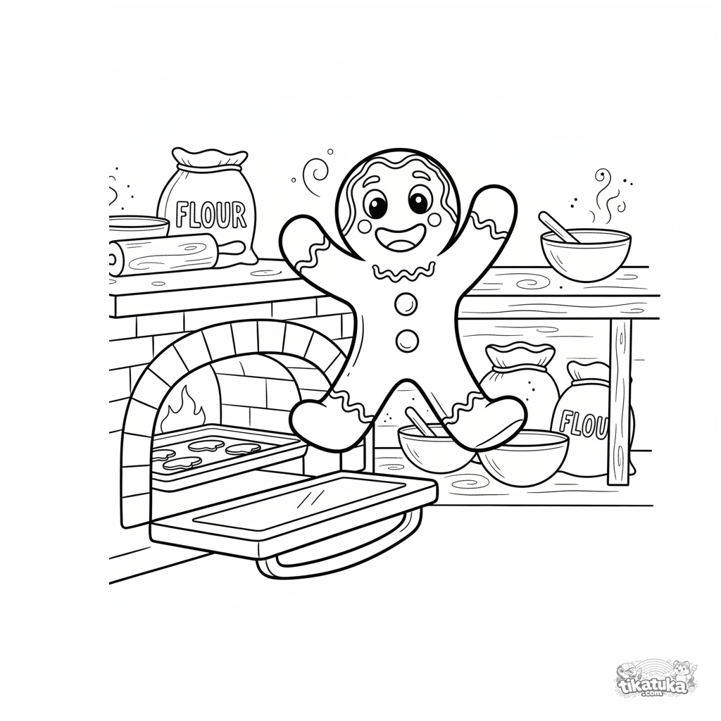 Märchen-Ausmalbild: Der Lebkuchenmann flieht aus dem Ofen in einer gemütlichen Bäckerei. Für Kinder von 5-8 Jahren. Lustige Szene mit Bonbonaugen und Küchenutensilien.
