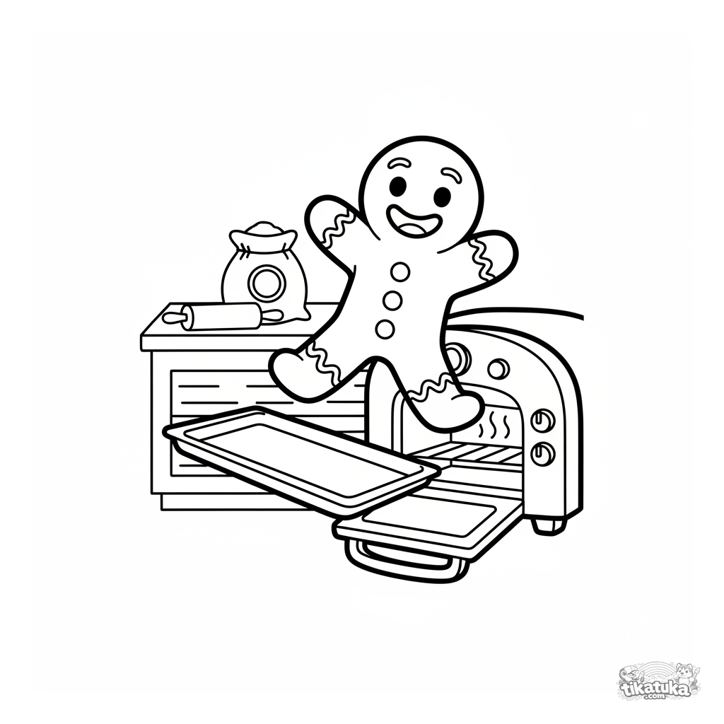 Einfaches Ausmalbild aus dem Märchen vom Lebkuchenmann. Für Kleinkinder von 2-5 Jahren. Der fröhliche Keks flieht vom Backblech, mit Küchenofen und Nudelholz im Hintergrund.