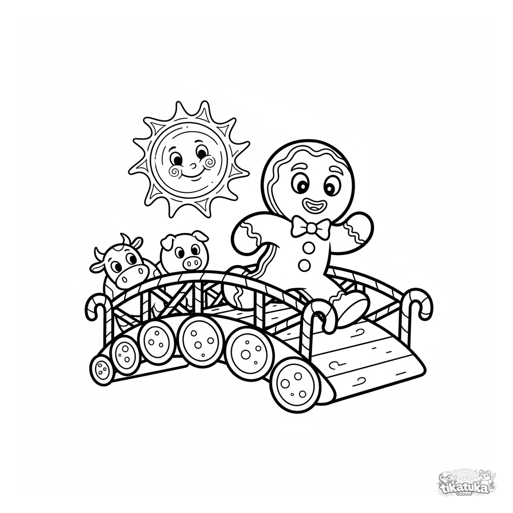 Ausmalbild für Kleinkinder aus dem Märchen: Der Lebkuchenmann läuft über eine Keksbrücke. Sehr einfache, große Formen, minimaler Hintergrund.