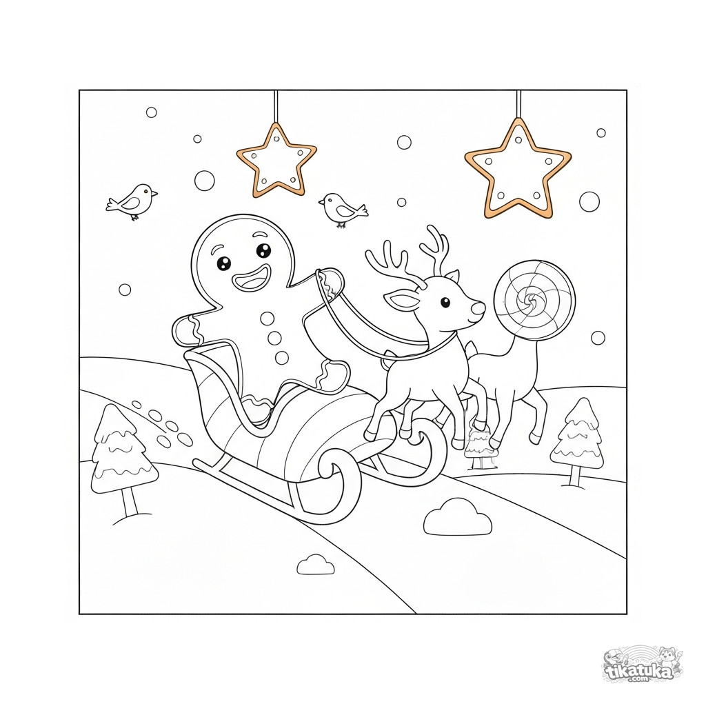 Einfaches Ausmalbild eines fröhlichen Lebkuchenmanns, der auf einem Zuckerstangen-Schlitten fährt. Für Kleinkinder von 2 bis 5 Jahren.