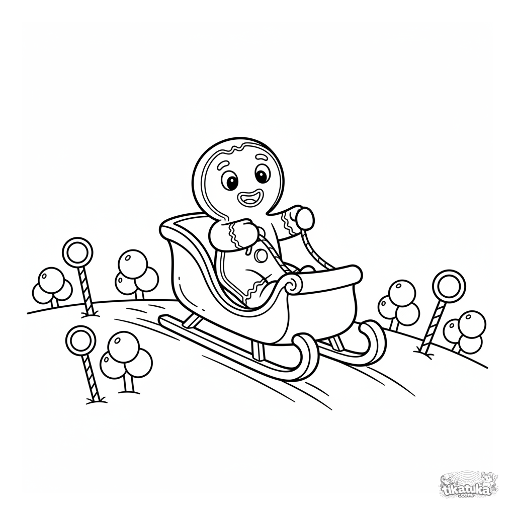 Einfaches Ausmalbild für Kleinkinder von 2-5 Jahren: ein fröhlicher Lebkuchenmann fährt auf einem Zuckerstangen-Schlitten einen Zuckerguss-Hügel hinunter.