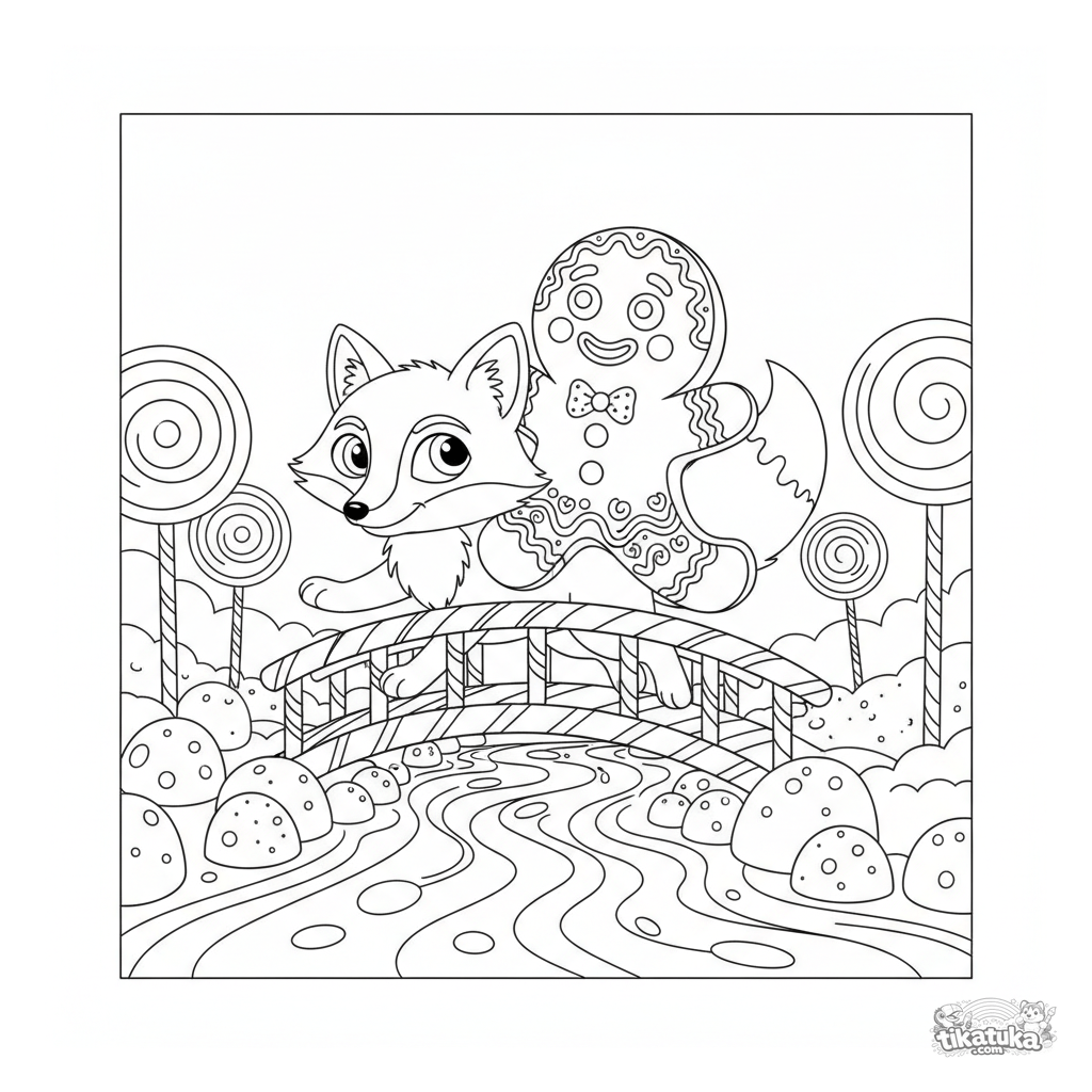 Ausmalbild aus dem Lebkuchenmann-Märchen. Für Kinder von 6-9 Jahren. Der Lebkuchenmann reitet auf einem Fuchs über eine Pfefferminzbrücke.