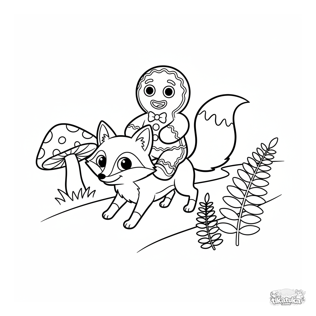 Einfaches Ausmalbild für Kleinkinder 2-3 Jahre: der Lebkuchenmann aus dem Märchen reitet auf einem Fuchs durch den Wald. Große Figuren, sehr einfache Details.