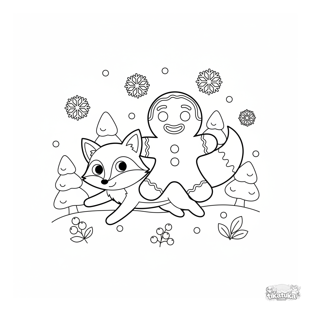 Ein einfaches Ausmalbild für Kleinkinder von 2-3: ein Lebkuchenmann reitet auf einem Fuchs durch einen Winterwald. Große, einfache Formen, perfekt für erste Malversuche.