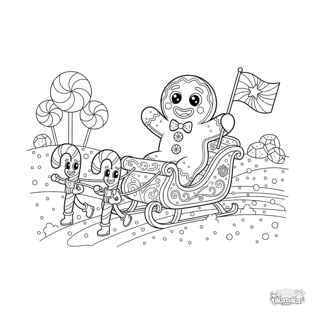 Märchen-Ausmalbild eines Lebkuchenmanns auf einem Zuckerguss-Schlitten, der von Zuckerstangen gezogen wird. Für Kinder von 5 bis 8 Jahren.