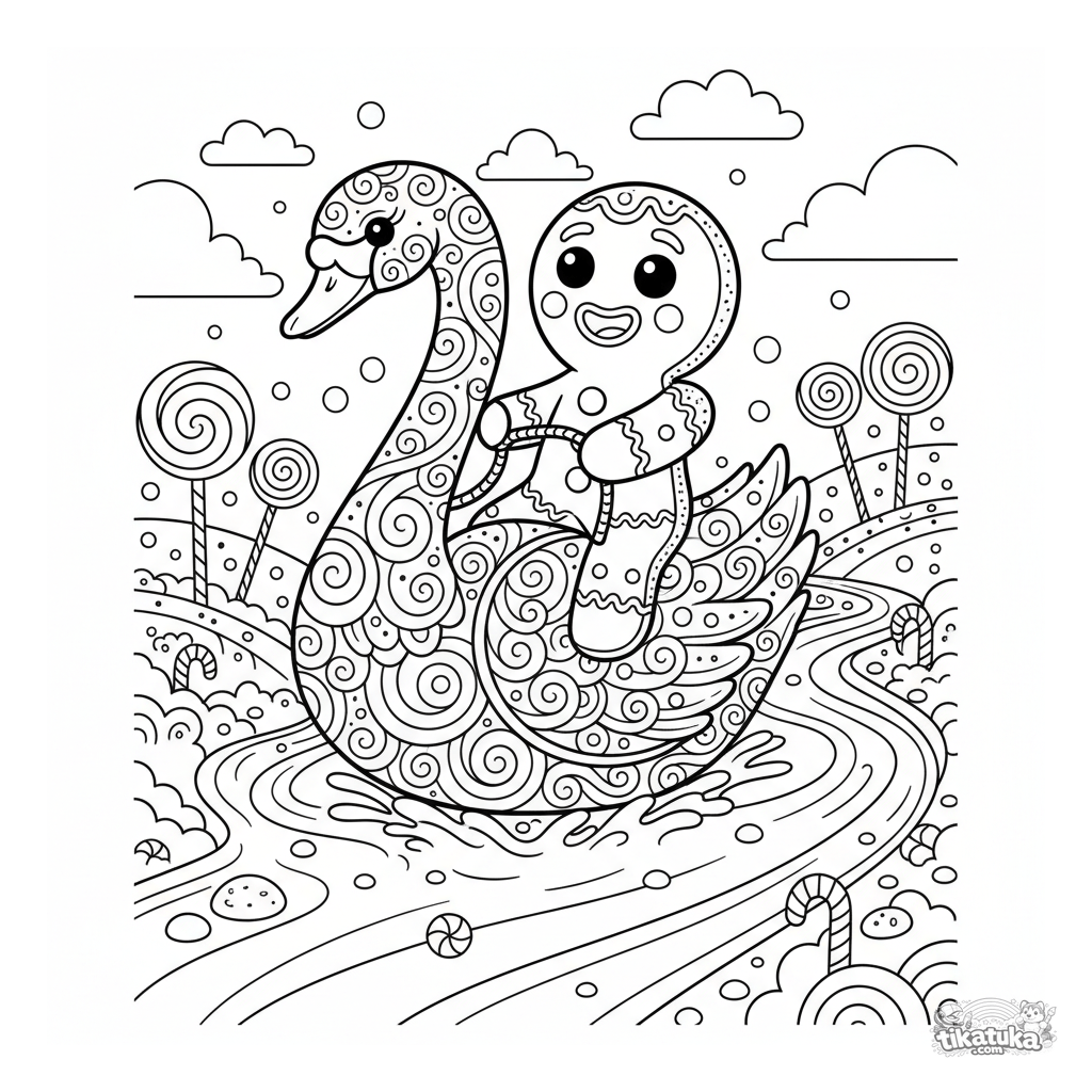 Märchen-Ausmalbild: Ein Lebkuchenmann reitet auf einem Zuckerguss-Schwan über einen Milchfluss. Für Kinder von 6-9 Jahren. Viele Süßigkeiten-Details.