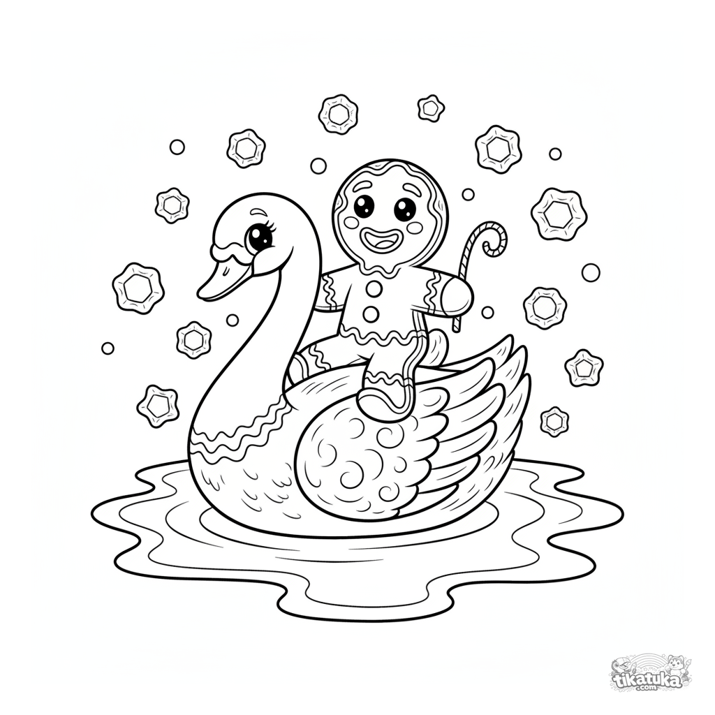 Ausmalbild eines fröhlichen Lebkuchenmanns, der auf einem Zuckerguss-Schwan über einen milchigen See reitet. Für Kinder von 5 bis 8 Jahren.