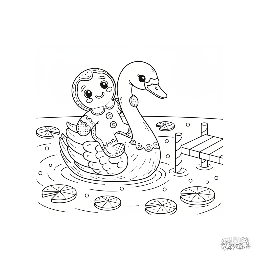Märchen-Ausmalbild eines Lebkuchenmanns, der auf einem Zuckerguss-Schwan über einen milchigen See reitet. Für Kinder von 6 bis 9 Jahren. Eine süße, magische Süßigkeitenlandschaft.