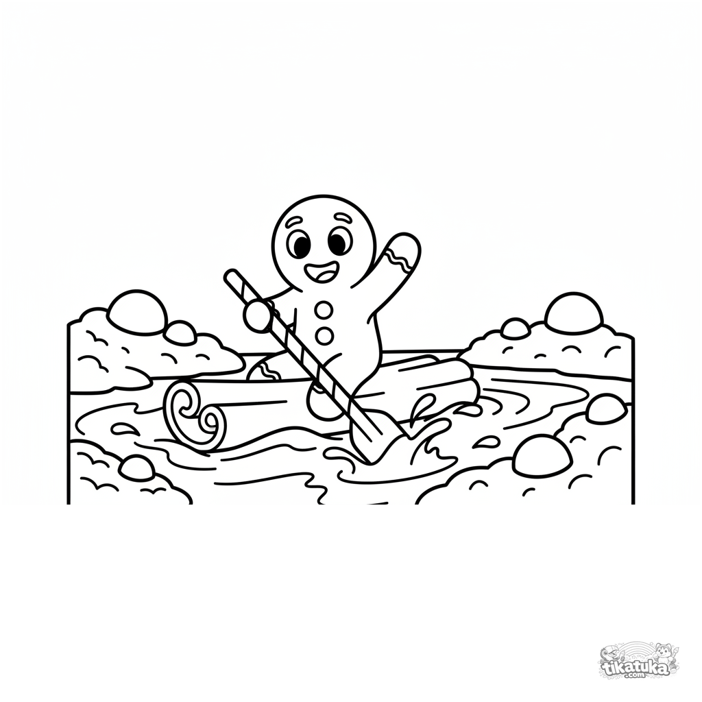 Einfaches Ausmalbild für Kleinkinder: ein fröhlicher Lebkuchenmann fährt auf einem Zimtstangen-Boot einen Milchfluss hinunter. Für 2-3 Jahre, große Formen.