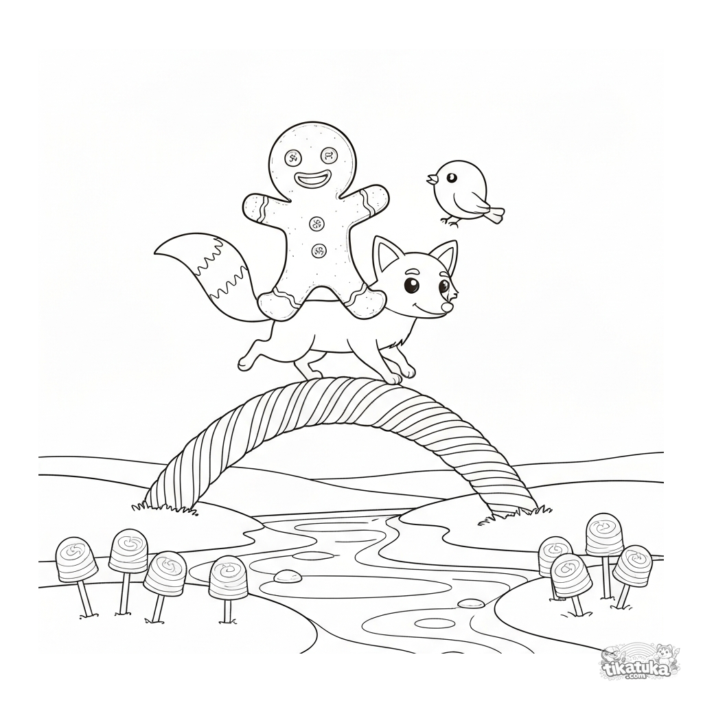 Märchen-Ausmalbild: Ein Lebkuchenmann reitet auf einem Fuchs über eine Pfefferminzstangen-Brücke. Für Kinder von 6-9 Jahren. Szene mit einem Schokoladenmilch-Fluss und Gummibärchen-Büschen.